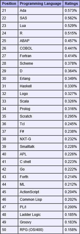 下面是第50到100的編程語言排名: